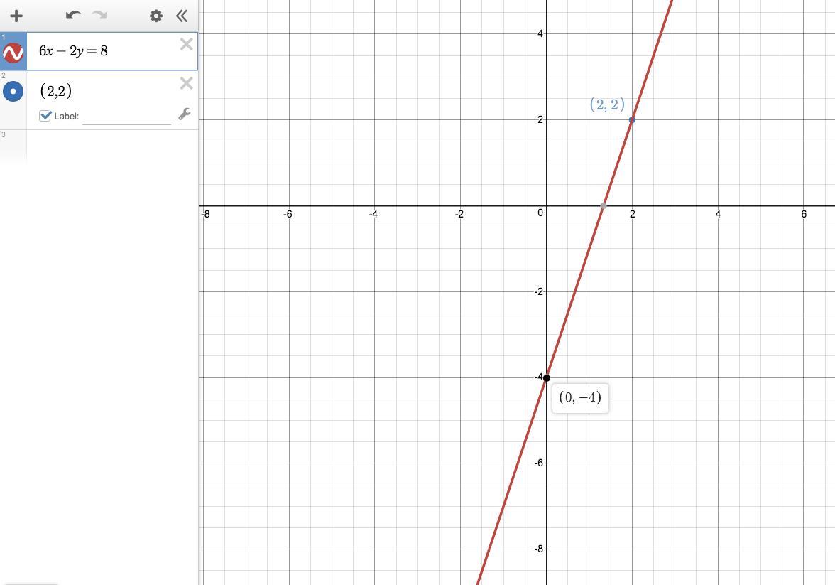It might be easier to recognize that changing the value of x by 1 will change the value of y by 3. Starting at the y-intercept of -4, you can find that points (1, -1) and (2, 2) are also on the line.