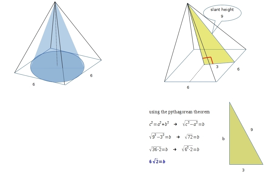 so, a cone inscribed in a square pyramid, like the blue one there, will have the a diameter that is the length of the base of the pyramid, as you can see there, is 6, now, since the radius is half of the diameter, that means r = 3.