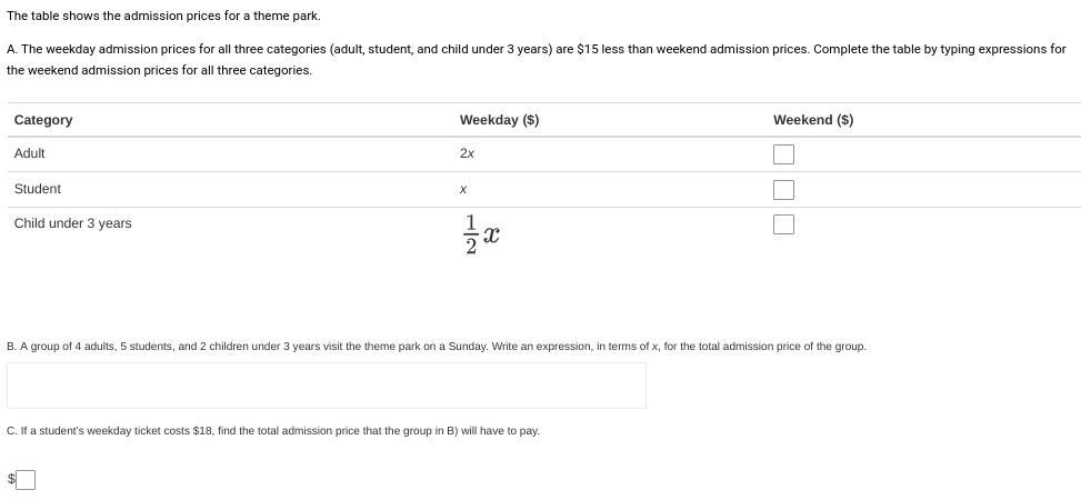 C; If a student's weekday cost's $18, find the total admission cost that group B) has to pay.