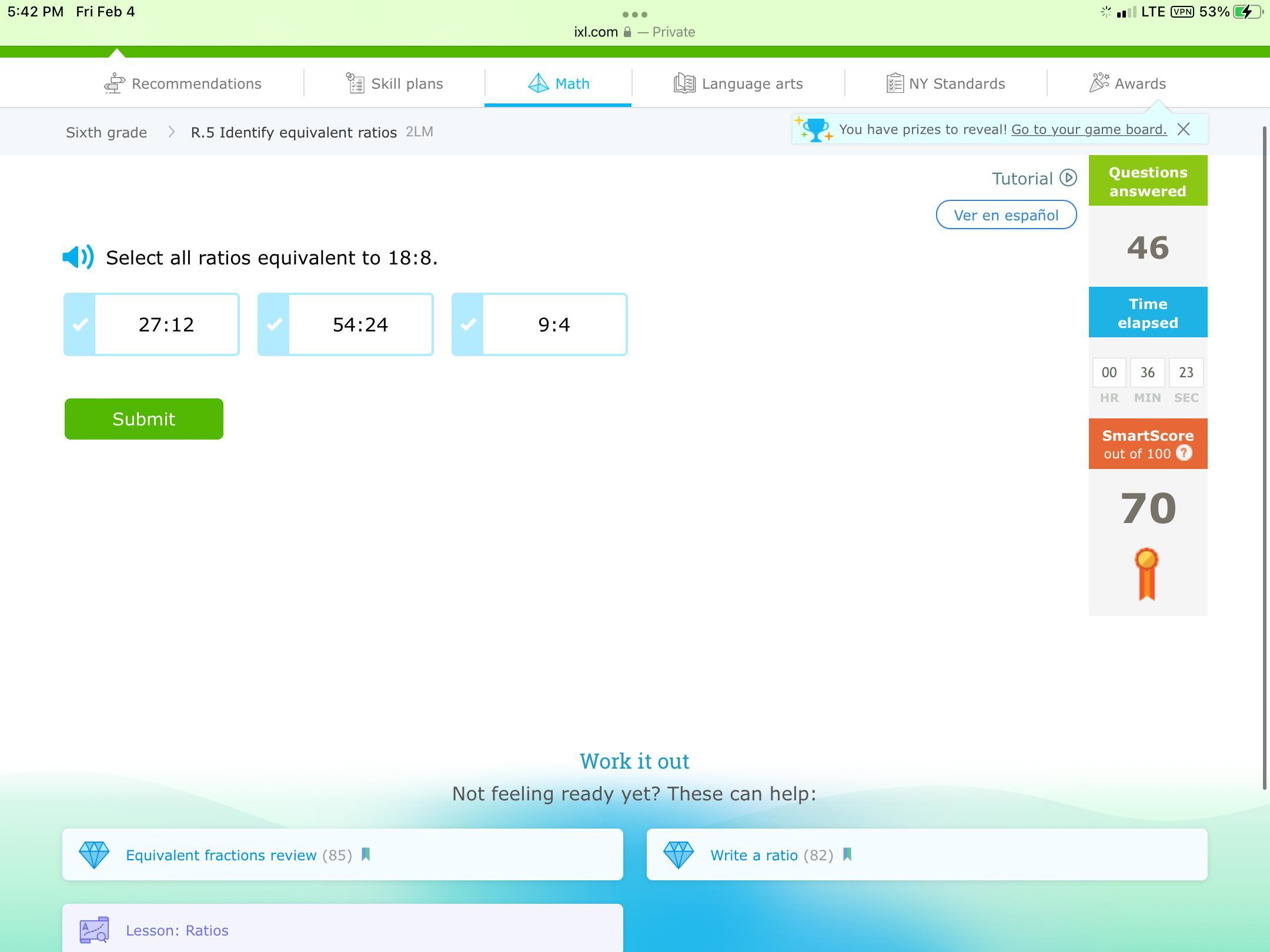 Since it says the ratio of the outside number to the inside number, take that number and see how many times it can fit into the outside number. In this case, it is 4, and than for the inside number, it is 3.