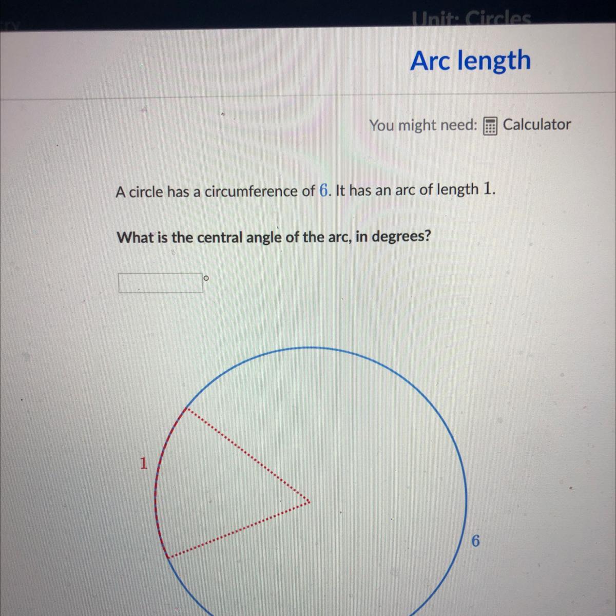A circle has a circumference of 6. It has an arc of length of 1. What is the central angle of the arc, in degrees?