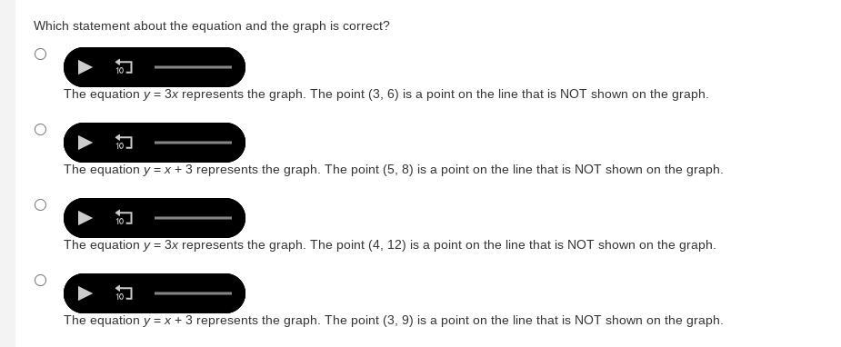 y = 3x represents the graph. The point (4, 12) is on the line that is not shown on the graph.
