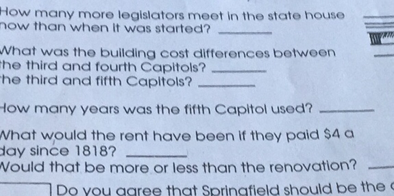 third and fourth Capitols?he third and fifth Capitols?How many years was the fifth Capitol used?What would the rent have been if they paid SA aday since 1818?Would that be more or less than the renovation?Do you agree that Springfield should be the