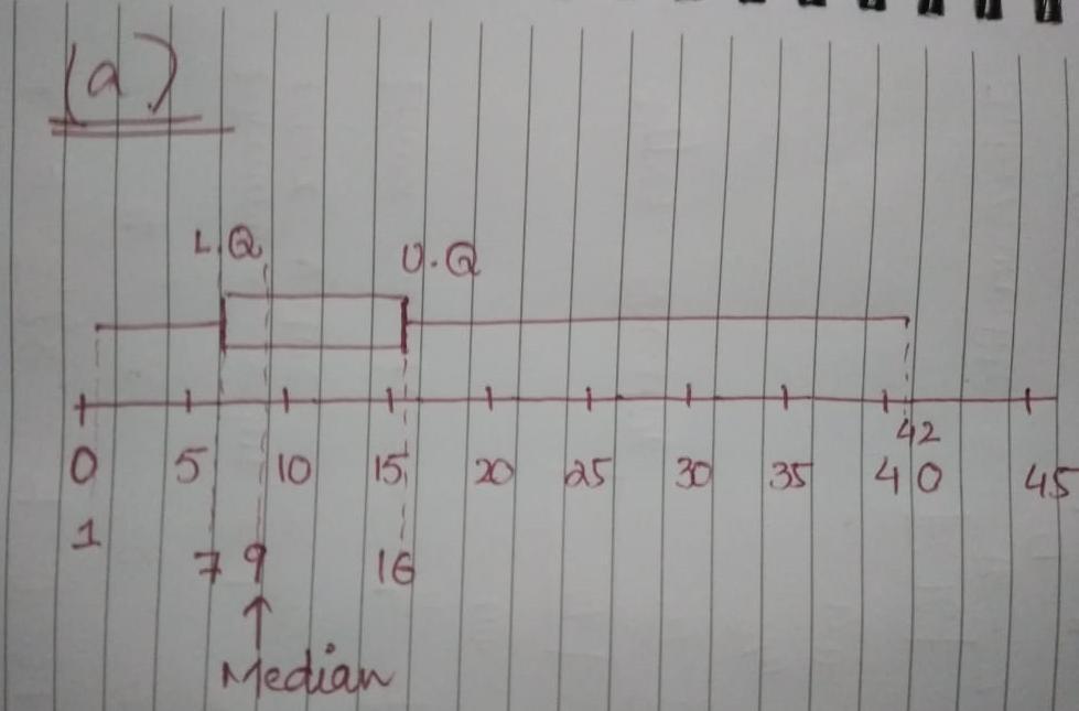 Upper Quartile = 3/4 x 16 = 12th value = 16 (1, 3, 5, 7, 8, 8, 9, 9, 11, 14, 15, 16, 16, 23, 38, 42)