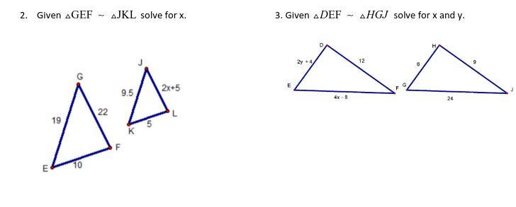 This means that the side measures of ΔJKL are 1/2 the corresponding side measures of ΔGEF