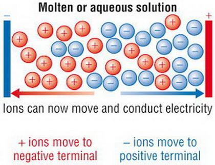 When the ions are the molten state or in aqueous solution, they are free to move towards the oppositely-charged electrodes. The movement of charge constitutes an electric current.