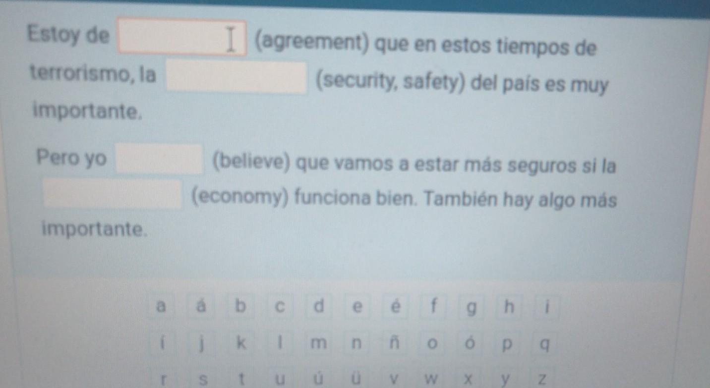 Estoy de <u><em>acuerdo</em></u><em></em>que en estos tiempos de <u><em>seguridad</em></u><em></em>del país es muy terrorismo, la importante. Pero yo <u><em>creo</em></u> que vamos a estar más seguros si la <u><em>economia</em></u> funciona bien. También hay algo más importante.