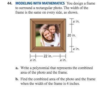 Therefore, polynomial representing the combined area of the photo in the frame will be (4x² + 84x + 440) square inches.