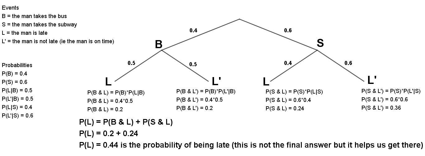 From the tree diagram, we can figure out that P(L) = 0.44 which is the probability of being late. Note how I considered the two probabilities P(B & L) and P(S & L)