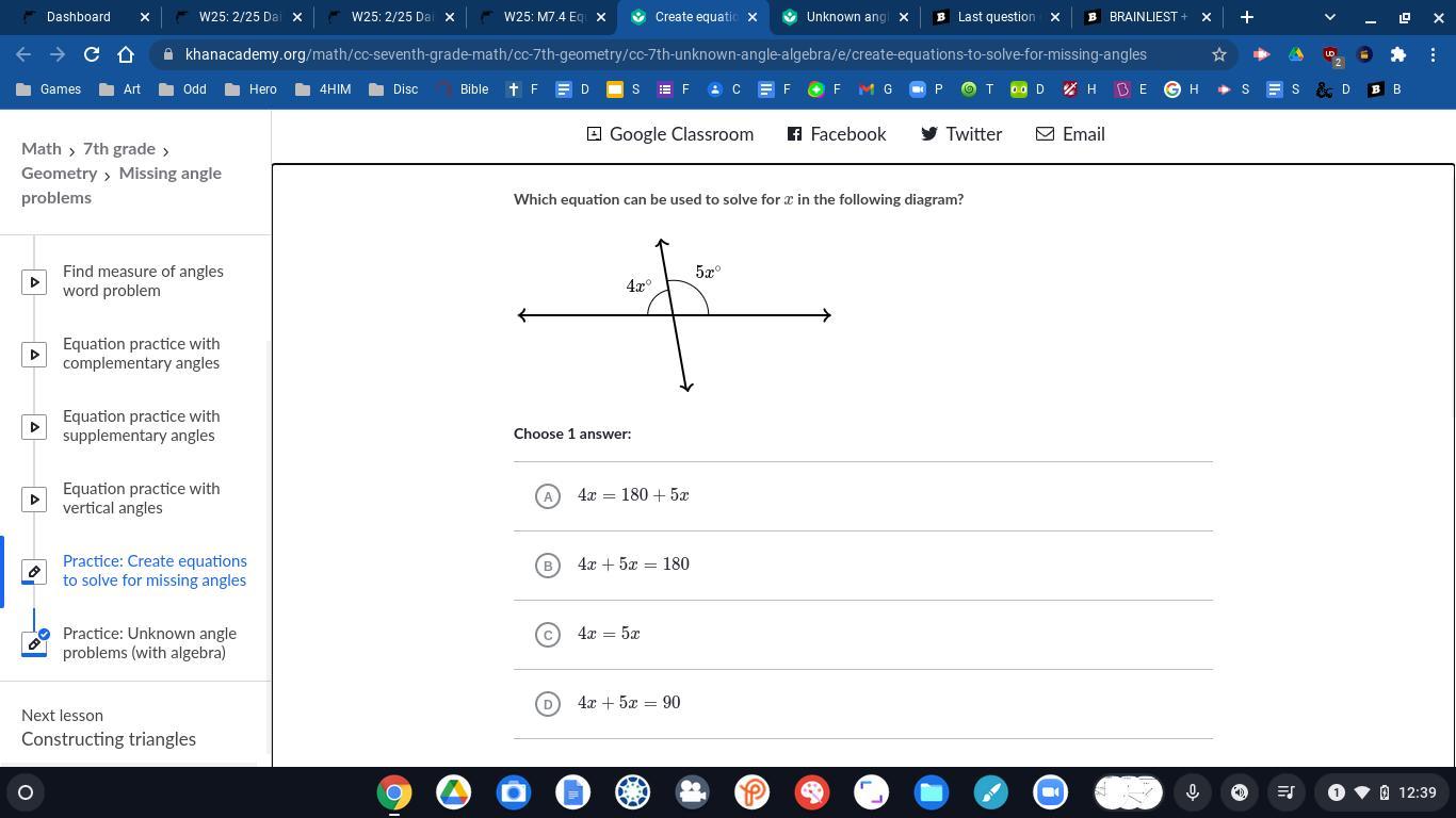 4x and 5x are adjacent angles on a straight line and sum to 180° , so