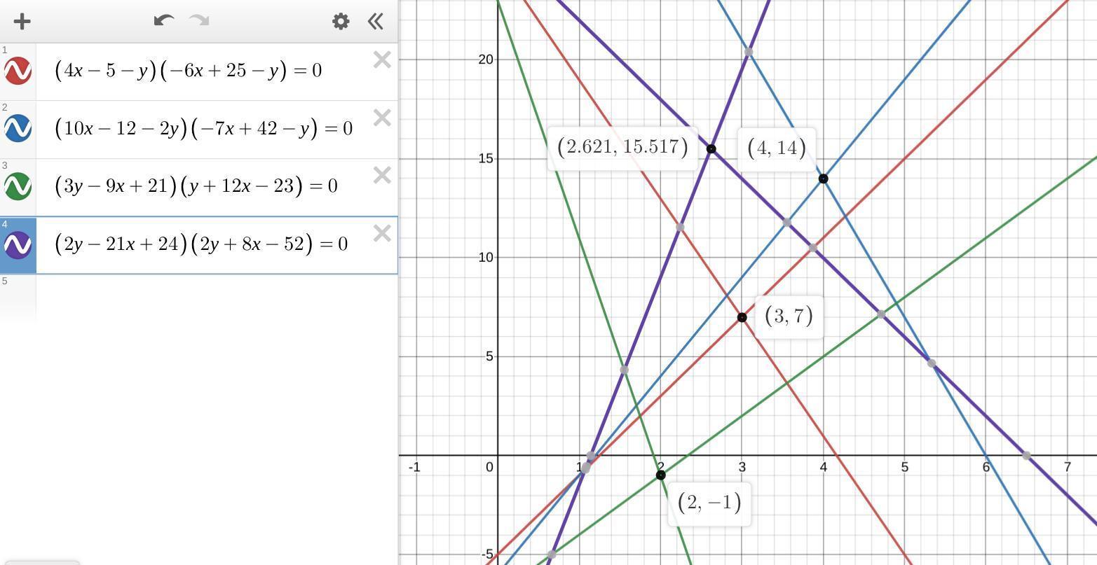 The attached shows plots of the lines and their points of intersection. Each pair is plotted in the same color.