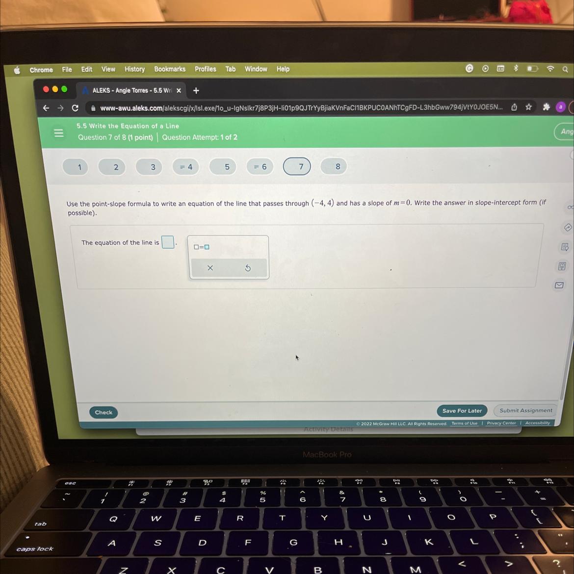 This line goes throught the "exact" grid intersections (-2, 0) and (3, 4). As we move from the first point to the second, we see that x increases by 5 (this is the 'run') and y increases by 4 (this is the 'rise'). Thus, the slope of this line is m = rise/run = 4/5.