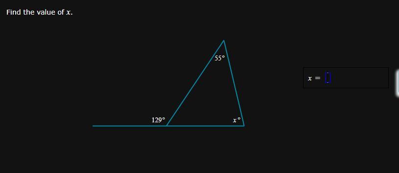 Angles on a straight line add up to 180 degrees so for the 129 degrees you will take 180 - 129 = 51. In the triangle you will add 51 and 55 = 106 but remember in a triangle all angles should be equal to 180. So 180 - 106 = 74. X=74degrees