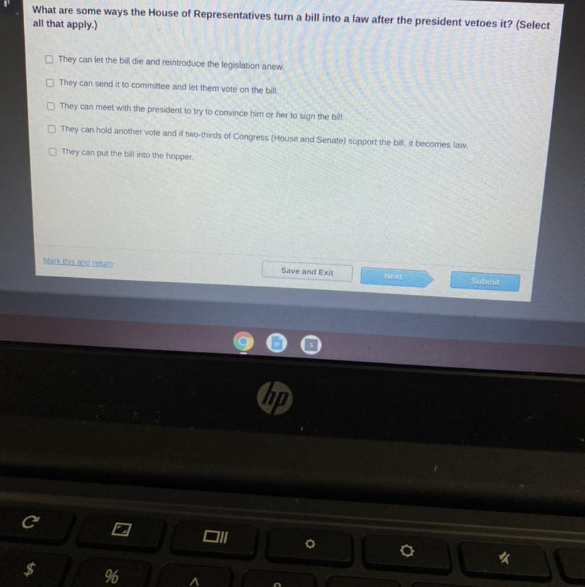 (HELP IM ON A TIMER, 3 MINUTES LEFT) What are some ways the House of Representatives turn a bill into a law after the president