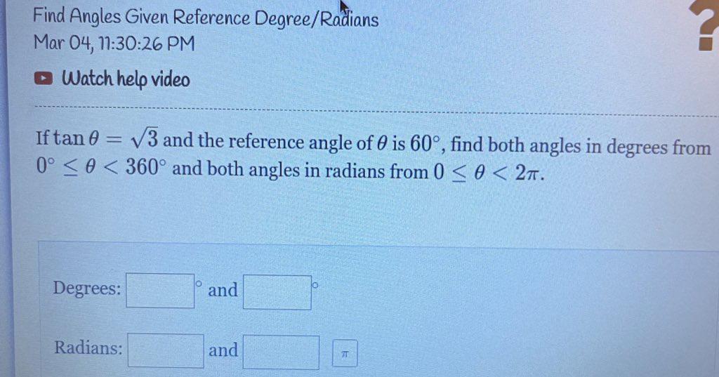 60°, 180°+60° = 240° . . . . . . possible angles in degrees