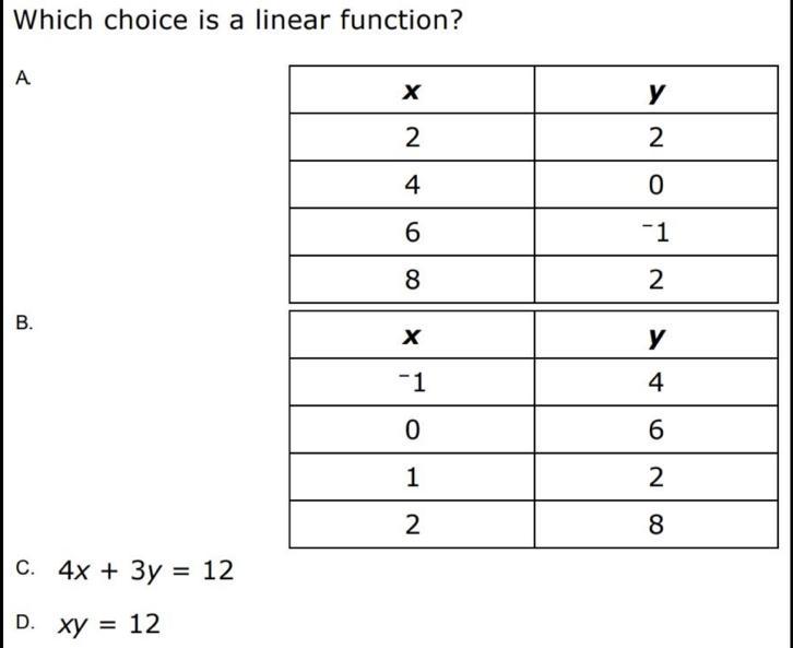 It's not option A, because in order for a table to be a linear function the change of x, and the change of y have to be constant. In this case our change in y goes through -2, to -1. Which means option A is not a linear function.