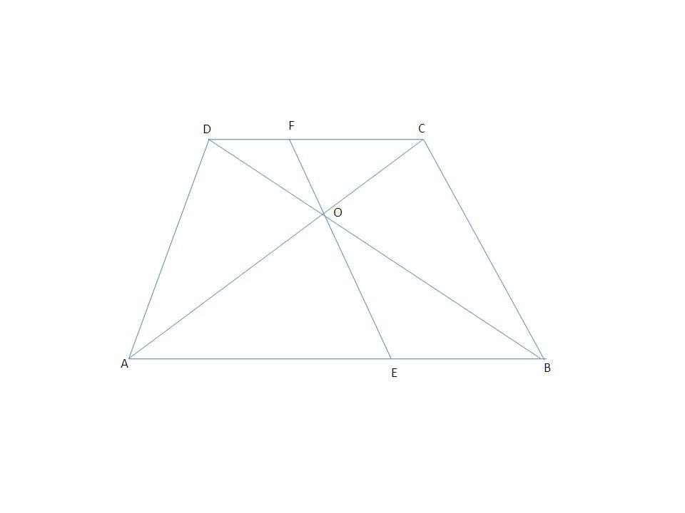 For the given case, referring to the attached figure, we can see that the lines AB and CD are parallel, the point of intersection of the diagonals is O, the line intersecting the bases is EF, the base whose segments' lengths' ratio are given is AB, and the base whose segments' lengths' ratio is to be found is CD.
