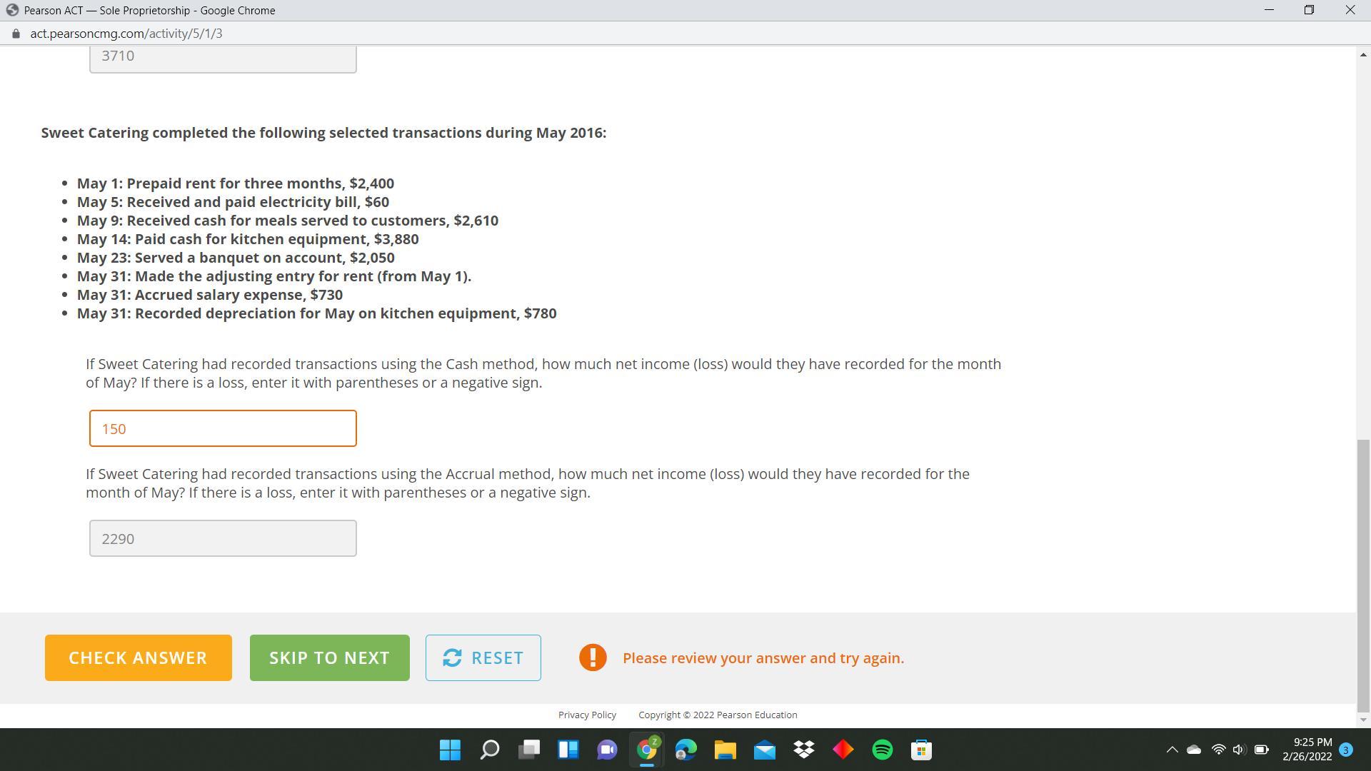 If Sweet Catering had recorded transactions using the Cash method, the net loss recorded for the month of May would have <u>($3,730)</u>.