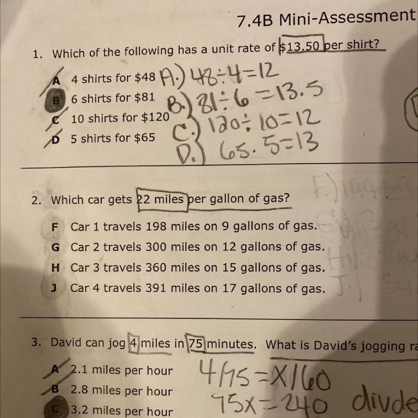 • 1st question: Which TWO ratios below are equal? A) 3 to 8, C) 4 to 6, B) 6 to 9, D) 8 to 12 . Answer:___?