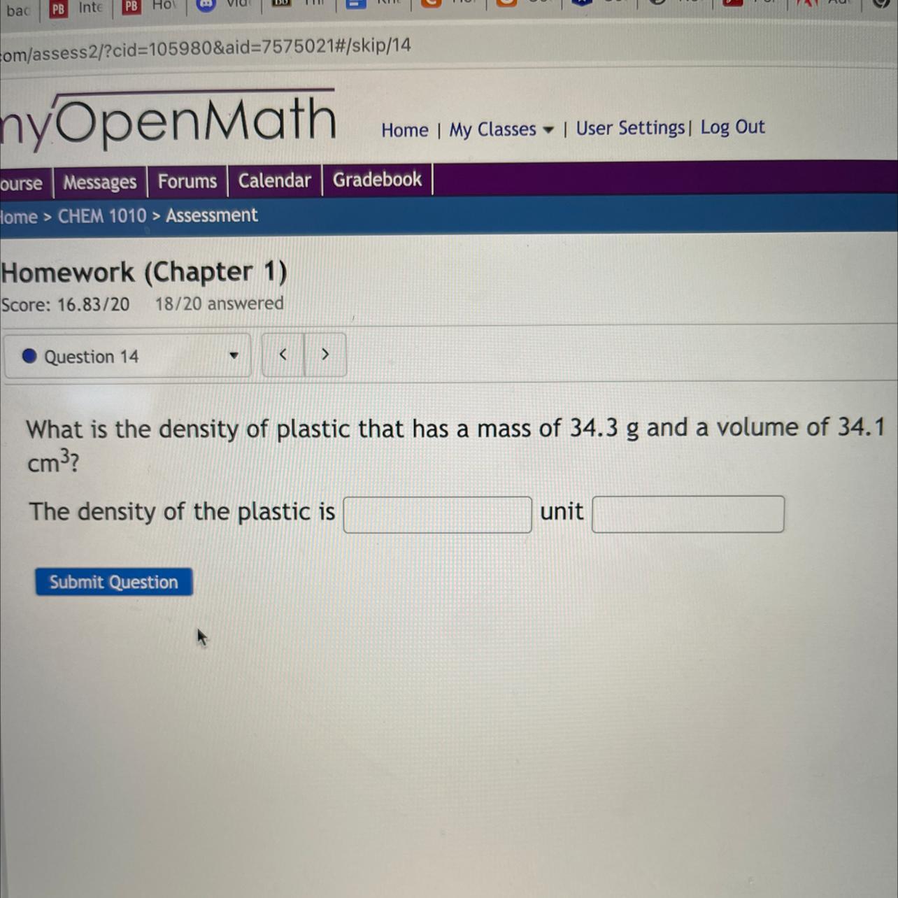 The volume of a sample of gas (2.49 g) was 752 mL at 1.98 atm and 62∘C 62 ∘ C .