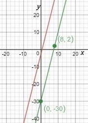 The graph of Equation 2 is the green line that passes through (8,2), runs parallel to Equation (1), and has a y-intercept at (0,-30.