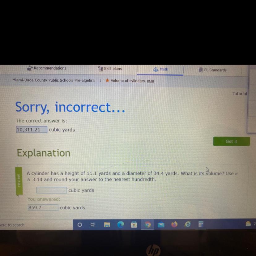 A cylinder has a height of 11.1 yards and a diameter of 34.4 yards. What is its volume? Use a