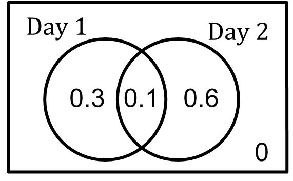We have P(Day 1 ∩ Day 2) = 0.1 and P(Day 1) = 0.4