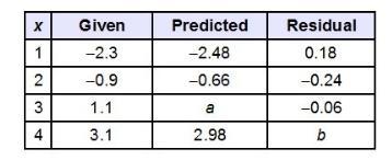 The missing values of a and b in the table of Miguel, wrote the predicted and residual values is 1.16 and 0.12 respectively.