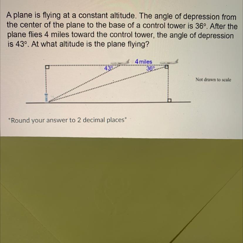 36°. After the plane flies 4 miles toward the control tower, the angle of depression is 43°. At what altitude is the plane flying?