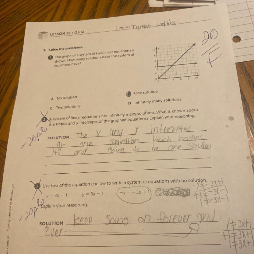 3) y=3x+1 and y=3x-1 can be used for a system with no solutions. No value of x can make the equations equal.