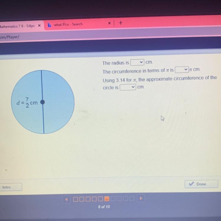 Circumference in terms of pi means to not approximate pi. Circumference of circle is πd, so the exact circumference would be 7/2 pi cm, 3.5 pi cm, or 3 1/2 pi cm.