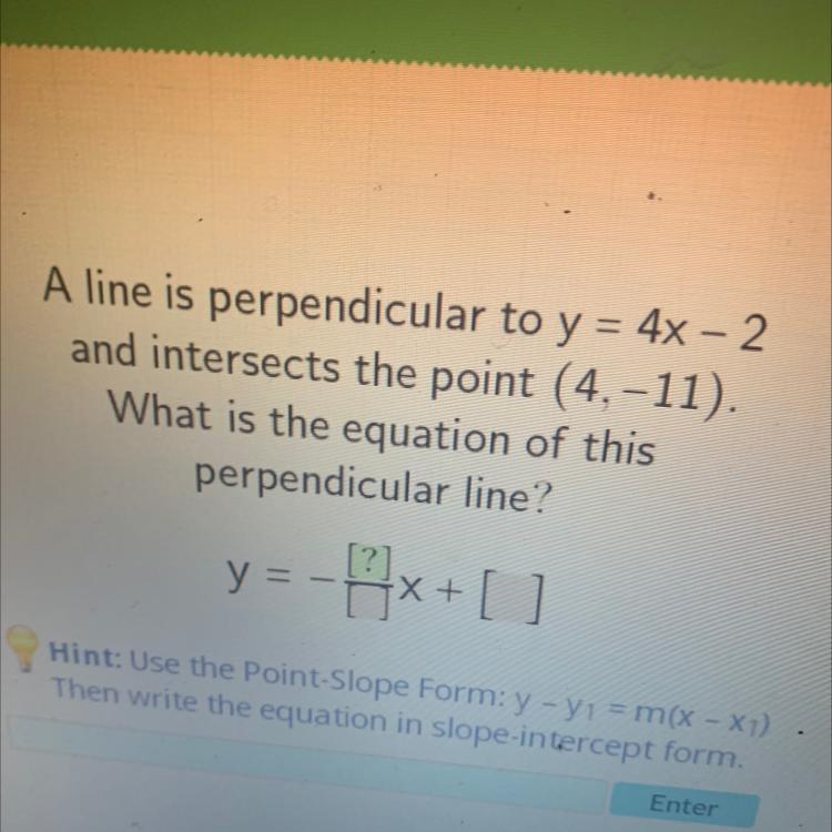 Perpendicular equations have OPPOCITE MULTIPLICATIVE INVERCE <em>RATE OF CHANGES</em> [<em>SLOPES</em>], so 4 becomes −¼. Now, proceed with plugging the information into the Slope-Intercept Formula: