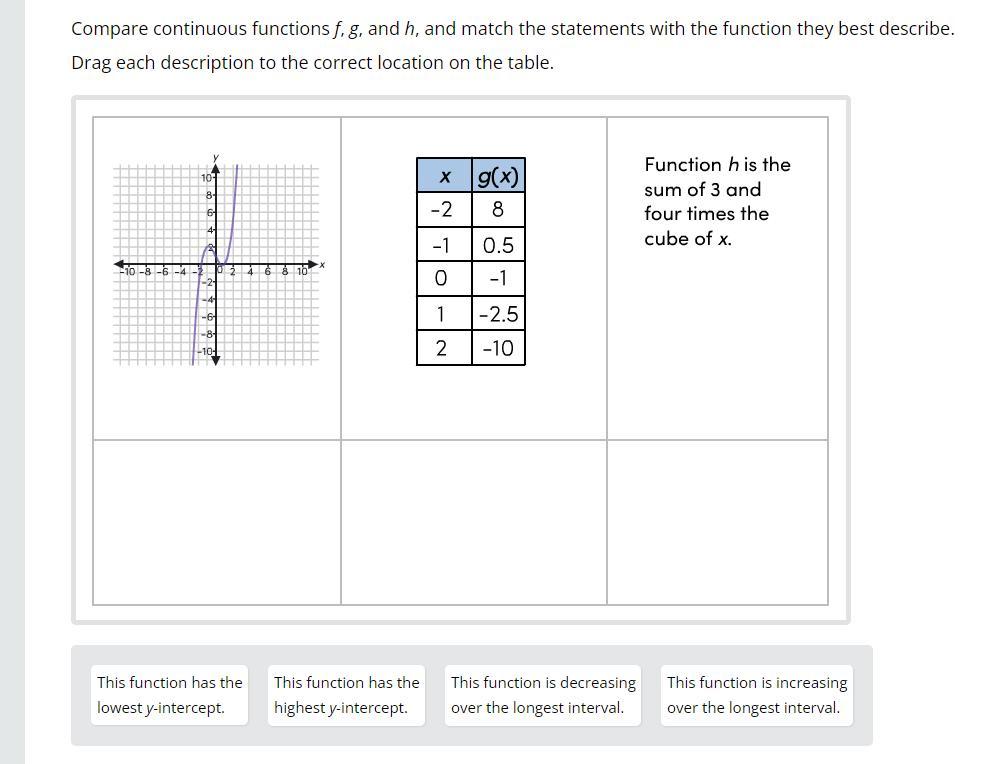Compare continuous functions f, g, and h, and match the statements with the function they best describe.