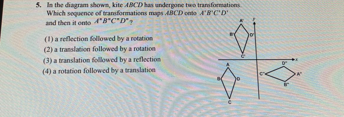 Next, to get to A''B''C''D'', we can see that A'' is now on the right. If this would be a rotation from A'B'C'D', we can visualize it as the shape rotating to the right. B'' would then be on top as it is to the left of A' in A'B'C'D', so if B' would be rotated to the right, it would then go to the top of A''. However, B'' is in the bottom, and D'' is on the top, signifying a flip of what the rotation would be. As this is not a simple shift, the only option left is a reflection.