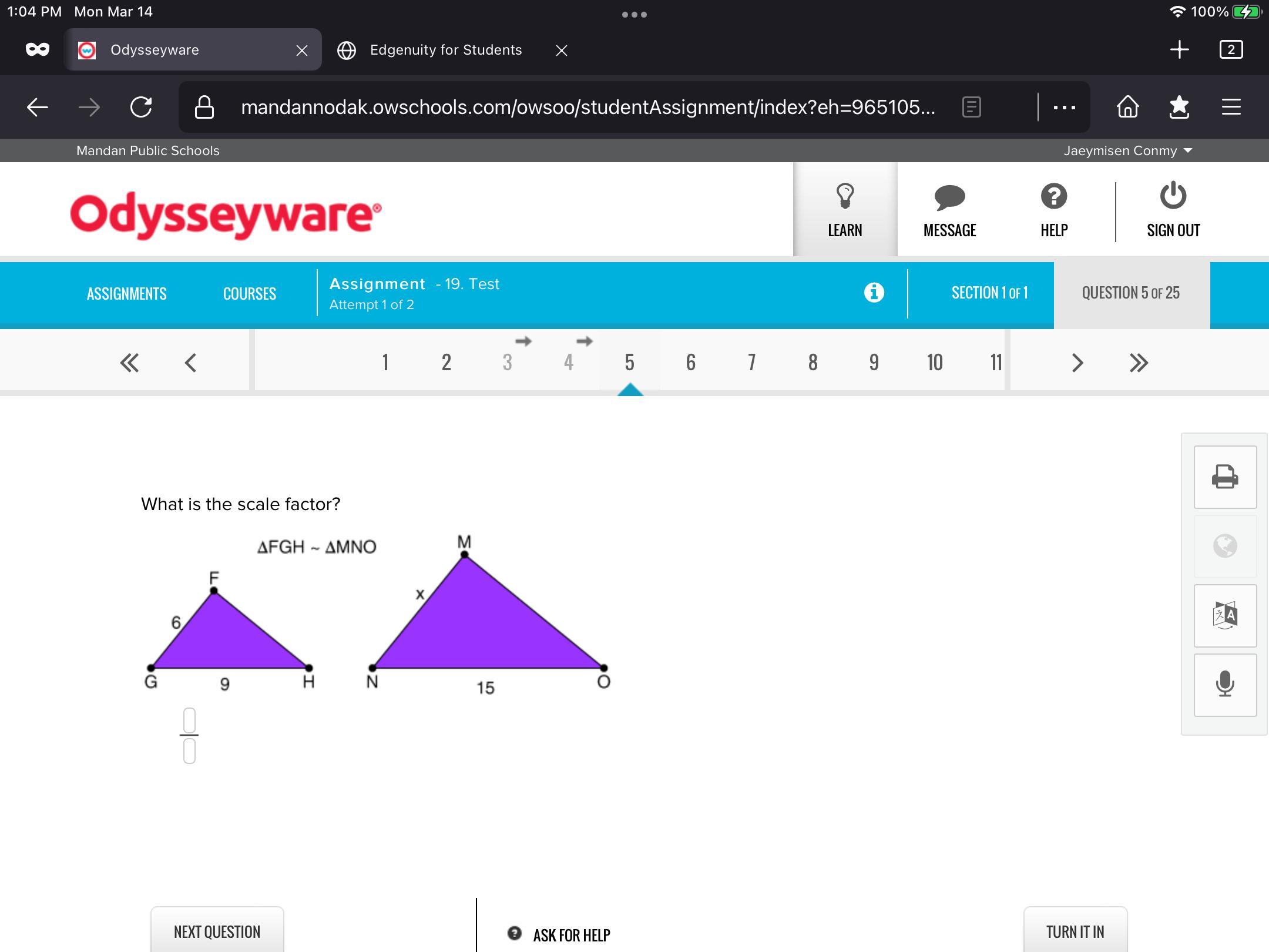 To find the scale factor, take the sides of the two triangles in proportion.