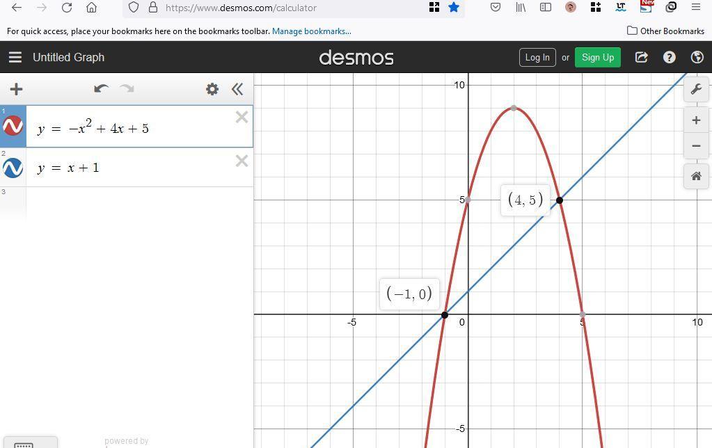 As you can see, the two equations intersect at (-1, 0) and (4, 5).