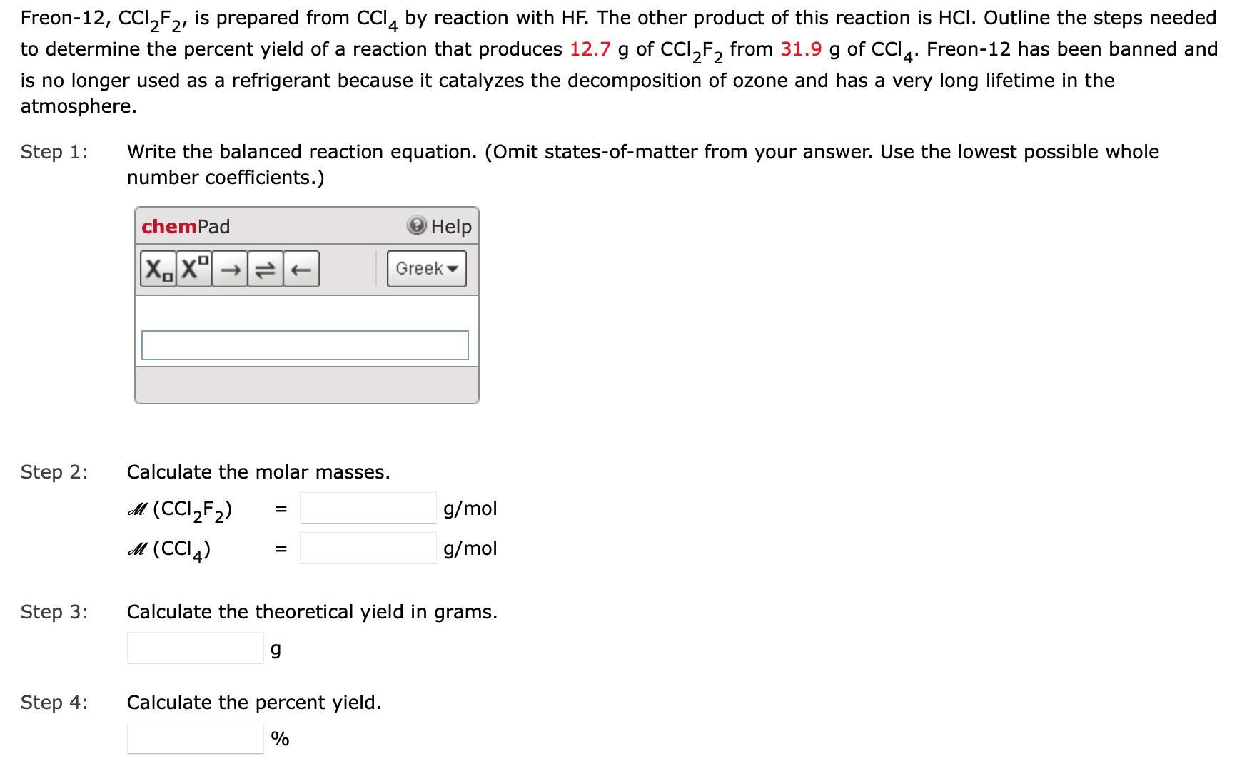 The unbalanced form of the equation is just what the problem tells you in the beginning: Freon is synthesized from CCl4 with HF. HCl is also made as a byproduct. This means that our equation will be: