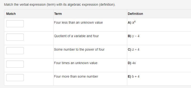 <u>C) z / 4 => Quotient of a variable and four</u>