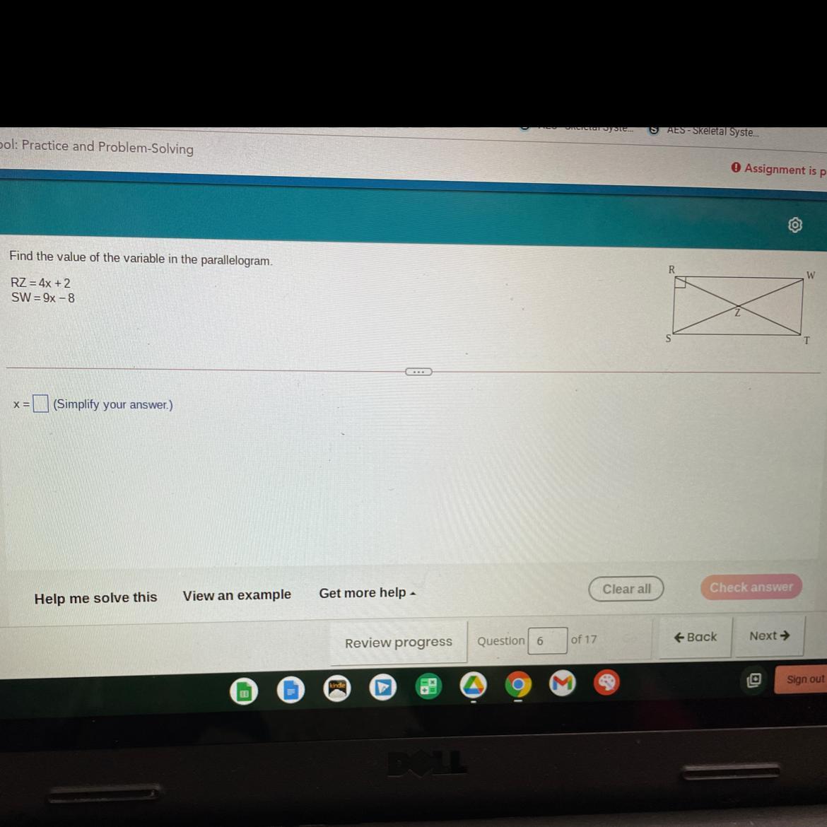 Find the value of the variable in the parallelogram. RZ = 4x + 2 SW=9x - 8 X=