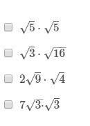 Remember that to multiply radicals/roots of the same index, we just need to multiply the radicans (the numbers inside the radical/root) and simplify. Let's simplify each of our expressions.