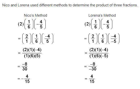 Nico and Lorena used different methods to determine the product of three fractions. Nico's Method Lorena's Method Whose solution