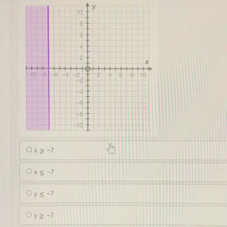 -the pink area includes numbers that are equal or less then -7 ( such as -8, -9,-10,...) so the inequality must be x ≤ -7 (the second choice. )