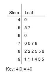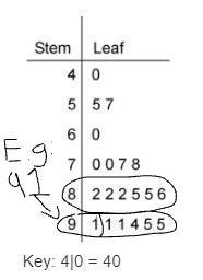 Step-by-step explanation: According to the key, 4|0 means 40, which applies to any other stem and leaf on the chart. For example, on the chart, any numbers to the other side of the 8 are more than 0 which can be 8|2 or 8|5, so those count. 9|0 or 90, is way bigger than 80, so any numbers next to 90 count as well. I circled all the numbers that are correct, which is 12.